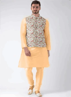 Teen Boys White Embroidered N Beige Bandi Set Party Wear