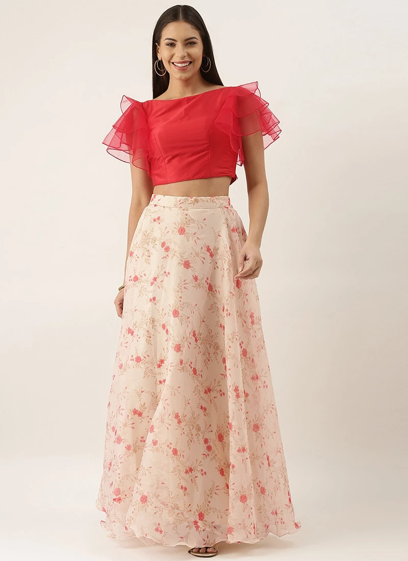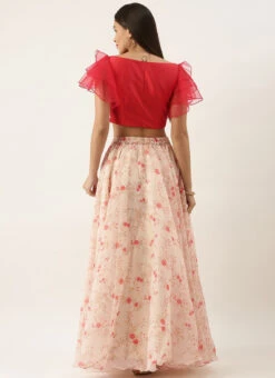 Teen Girls Beige Color Digital Printed Crop Top N Skirt Festive Wear