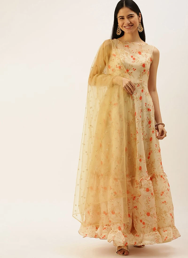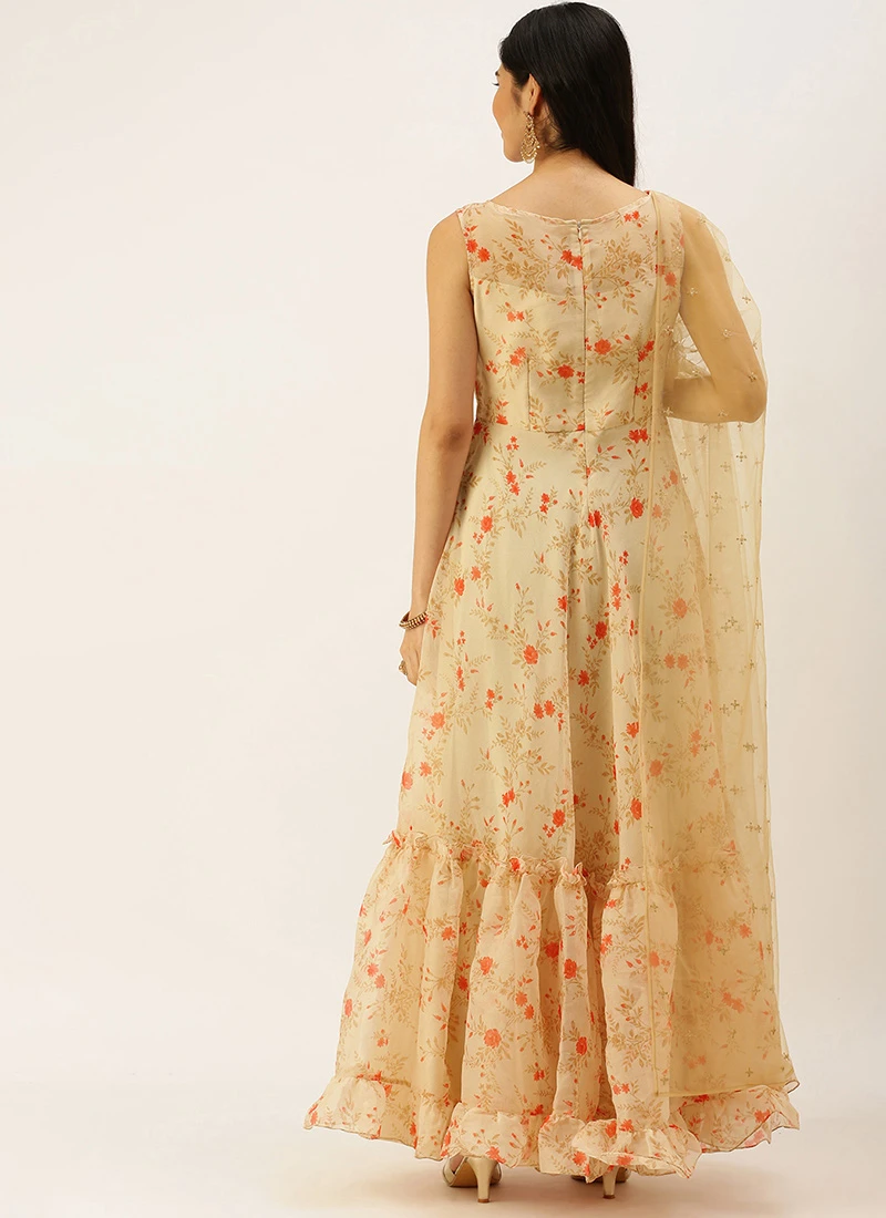 Teen Girls Beige Printed Organza Anarakali Suit Festive Wear
