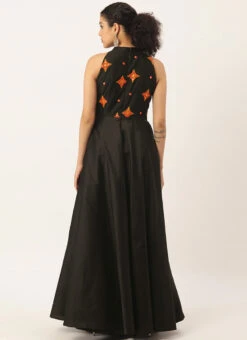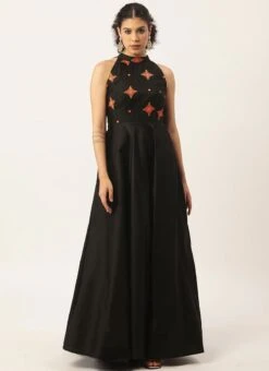 Teen Girls Black Embroidered Halter Neck Embellished Gown Festive Wear
