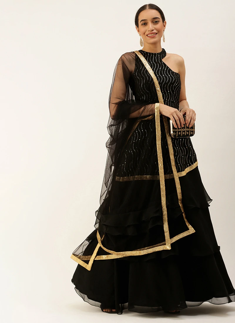 Teen Girls Black Embroidered Layered Lehenga Festive Wear