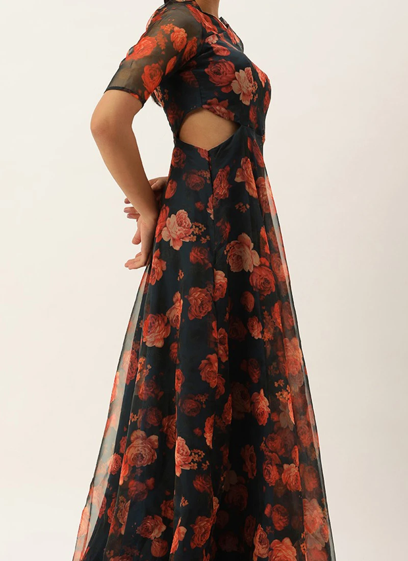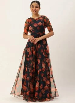 Teen Girls Blue Digital Printed Organza Gown Party Wear