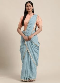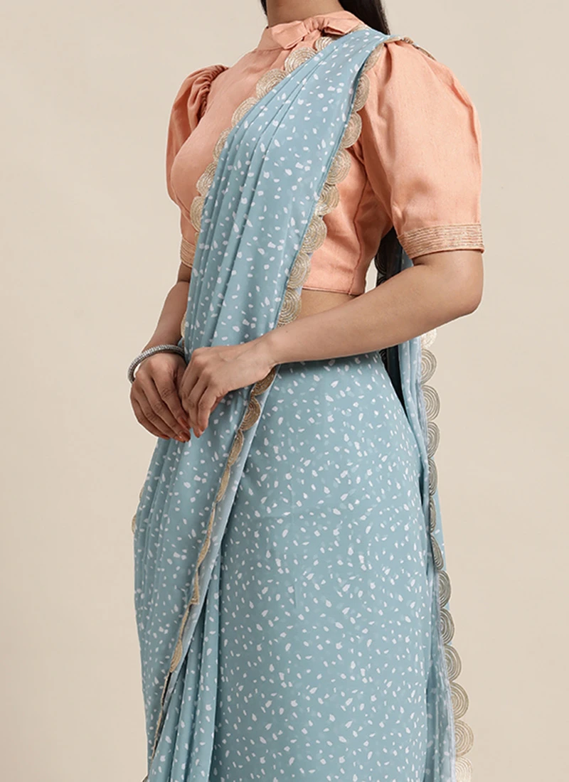 Teen Girls Blue N White Digital Printed Georgette N Blouse Festive Wear