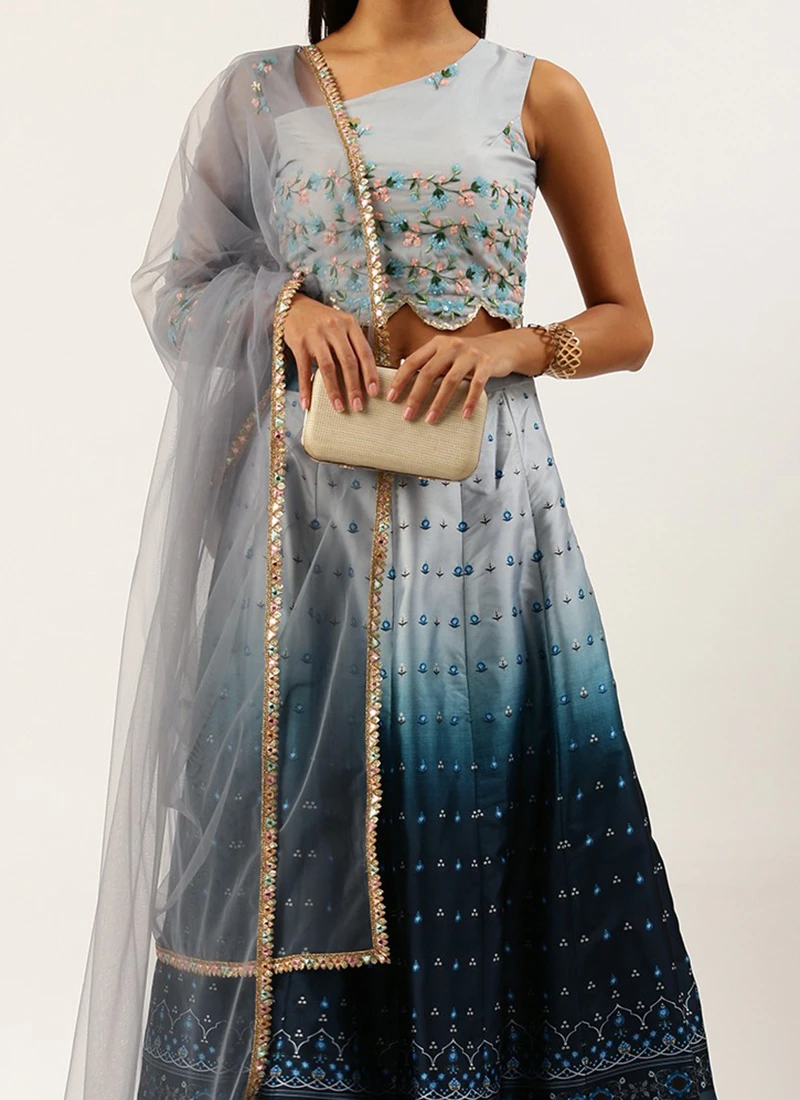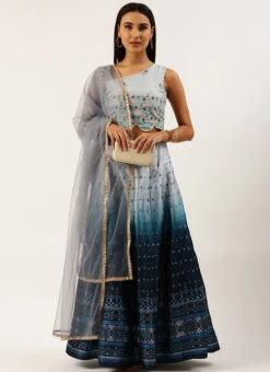 Teen Girls Blue Taffeta Digital Print Kali Lehenga Set Wedding Wear