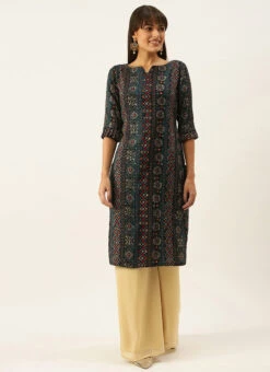 Teen Girls Dark Blue Printed Viscose N Beige Kurta Set Festive Wear