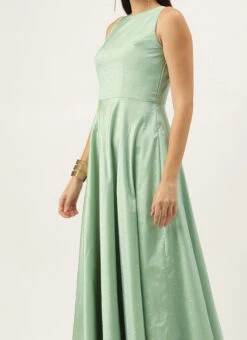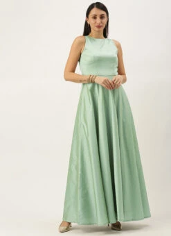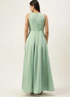 Teen Girls Greeen Jacquard Art Silk Halter Neck Gown Festive Wear