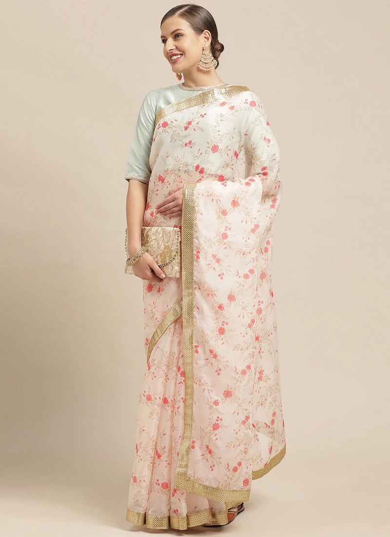 Teen Girls Green And Off White Floral Organza Saree Festive Wear