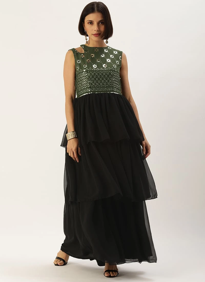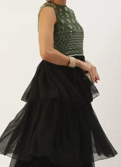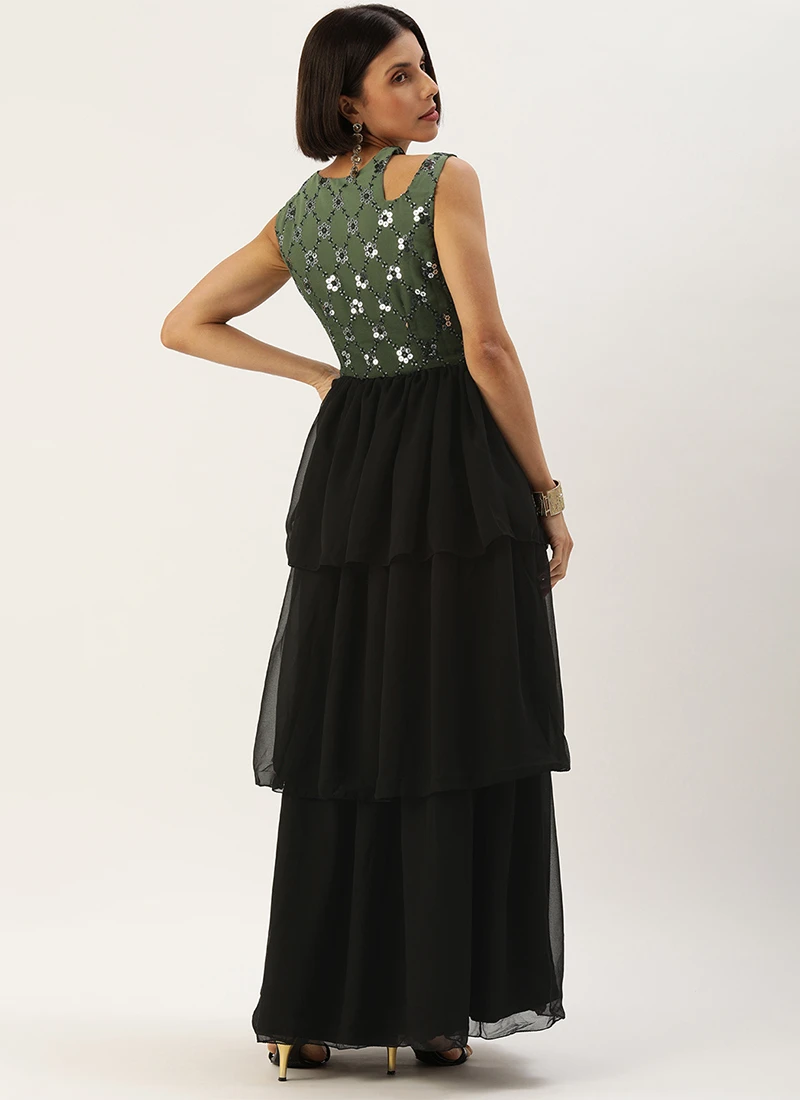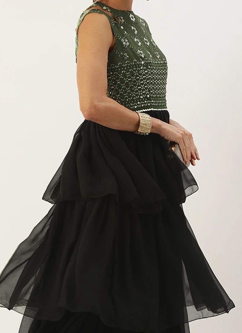 Teen Girls Green Georgette Embroidery Layered Gown Festive Wear