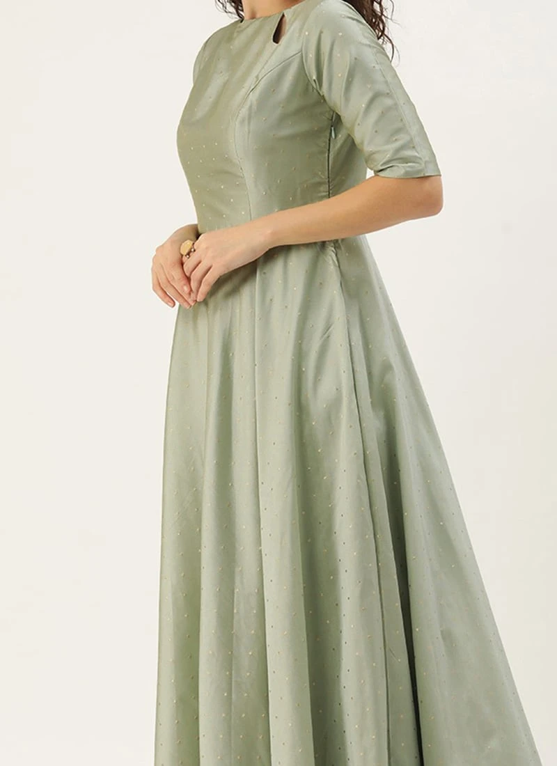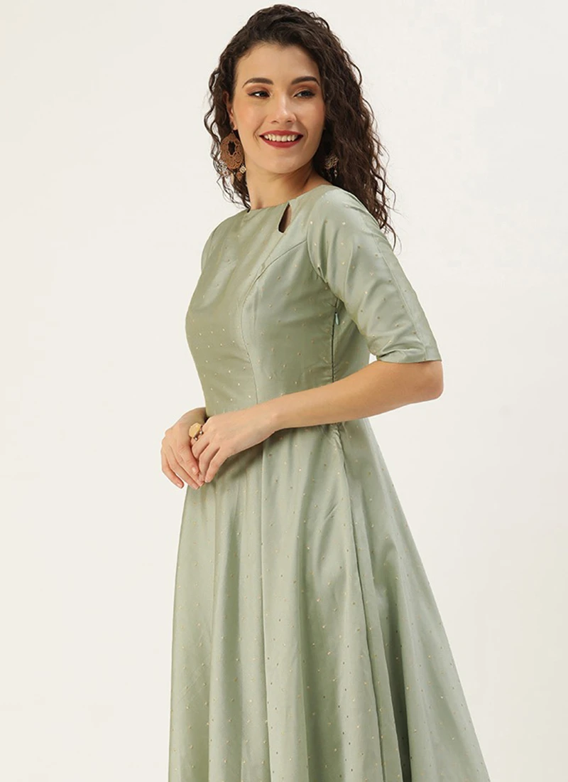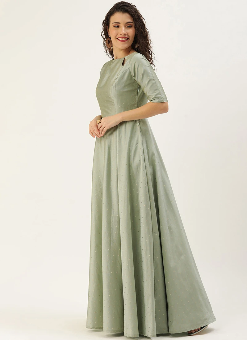Teen Girls Green Jacquard Floor Length Gown Festive Wear