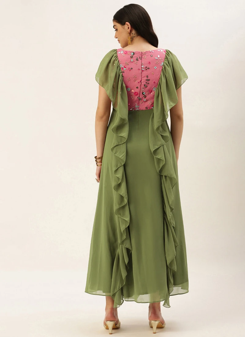 Teen Girls Green N Rouge Pink Chinon Ruffles Gown Party Wear