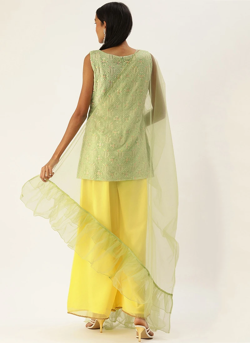 Teen Girls Green N Yellow Embroidered A Line Palazzo Suit Festive Wear
