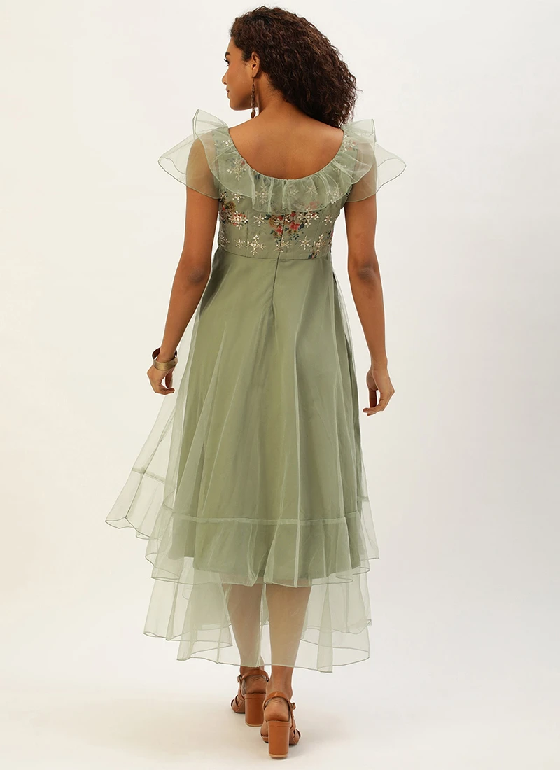 Teen Girls Green Organza Embroidered Gown Party Wear