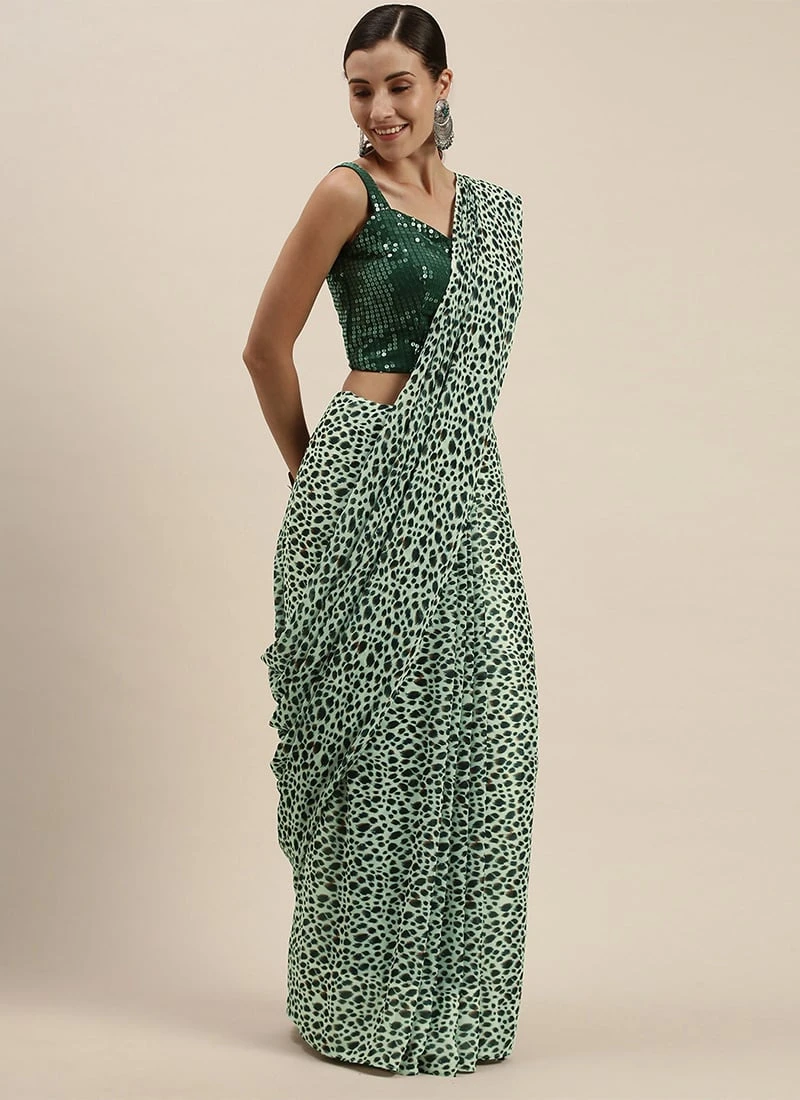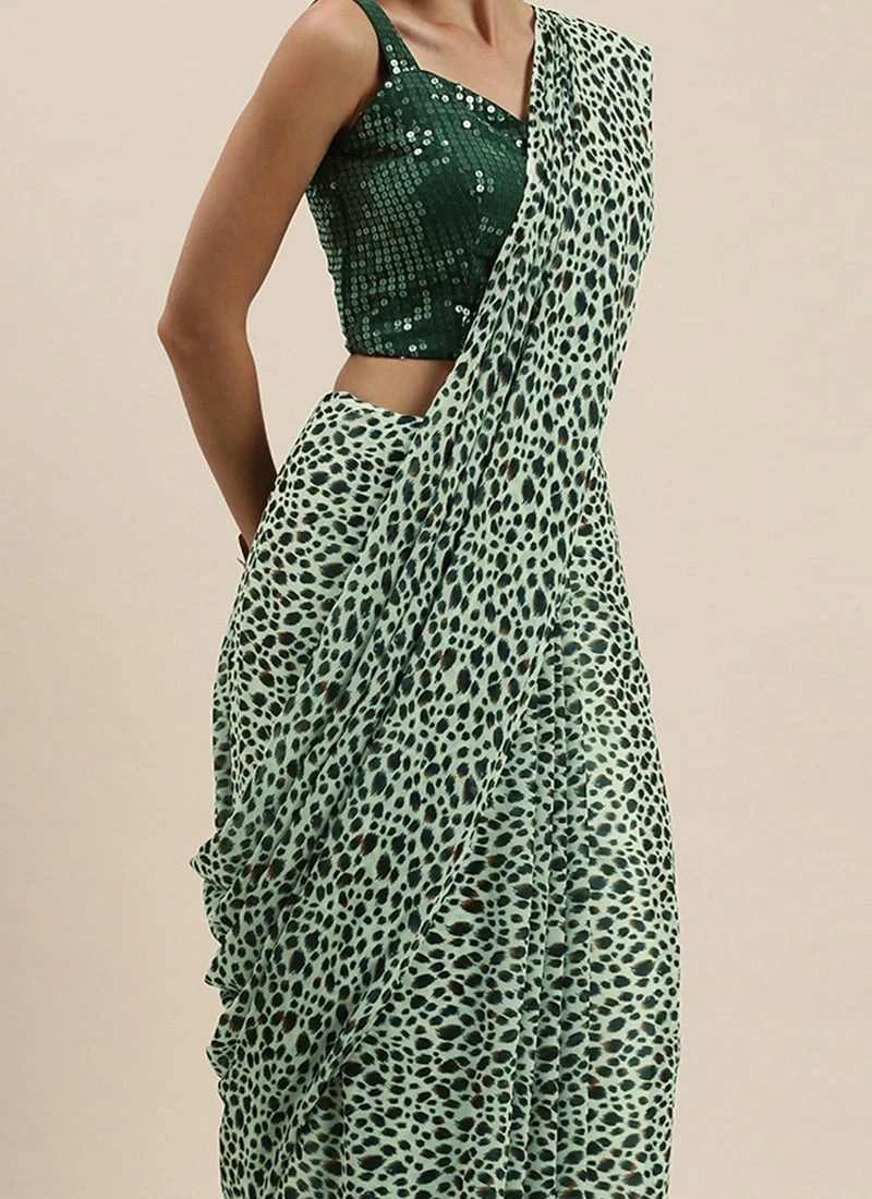 Teen Girls Green Sequins Blouse N Cream Printed Saree Party Wear