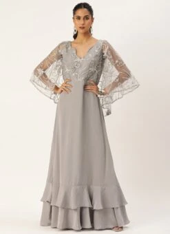 Teen Girls Grey Net Embroidered N French Crepe Gown Party Wear