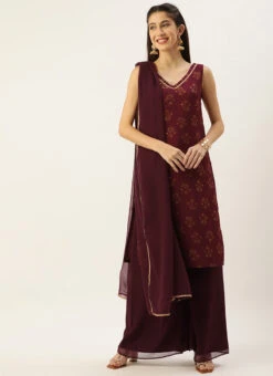 Teen Girls Maroon Rayon Printed V Neck Palazzo Suit Festive Wear