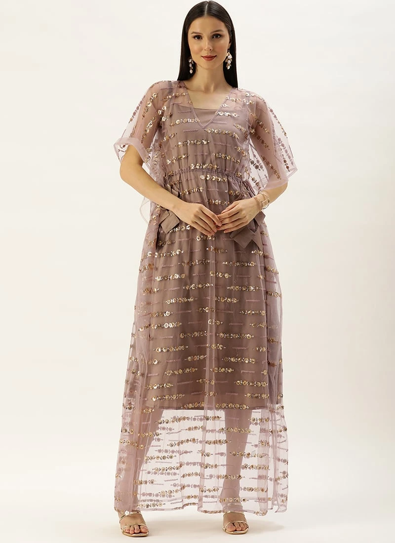 Teen Girls Mauve Net Embroidered Kaftan Style Gown Party Wear