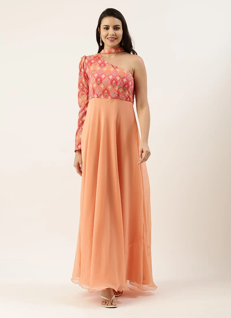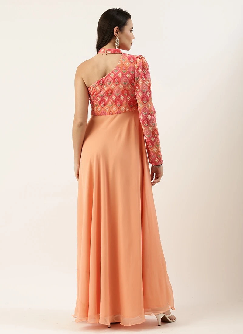 Teen Girls Multicolored Embroidered One Shoulder Gown Festive Wear