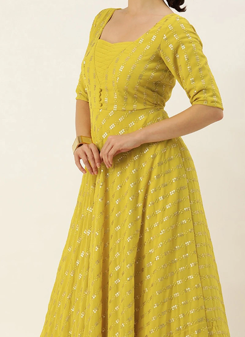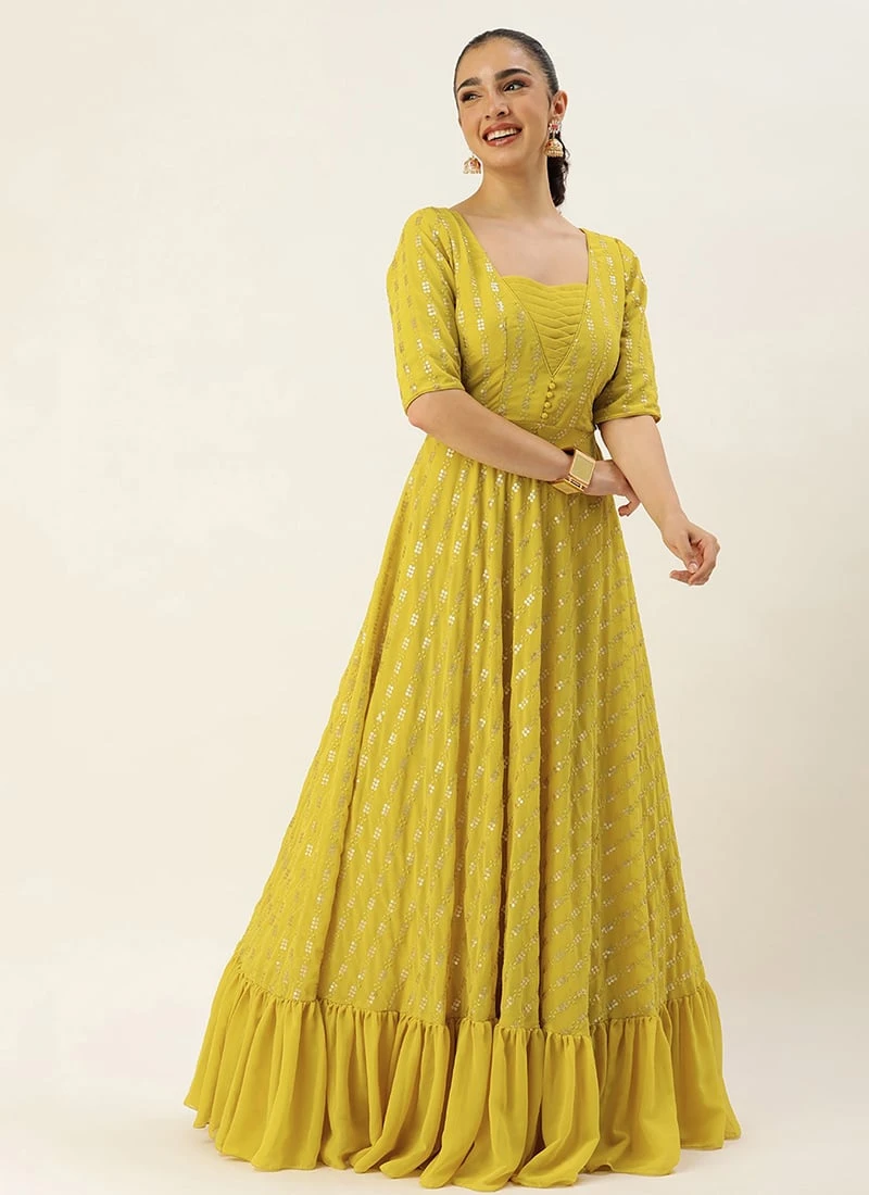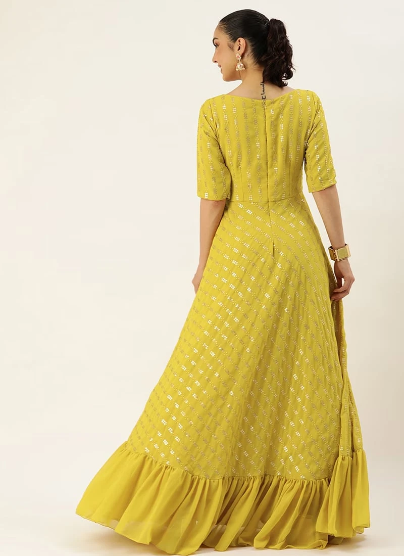 Teen Girls Mustard Georgette Embroidered Sequins Gown Wedding Wear