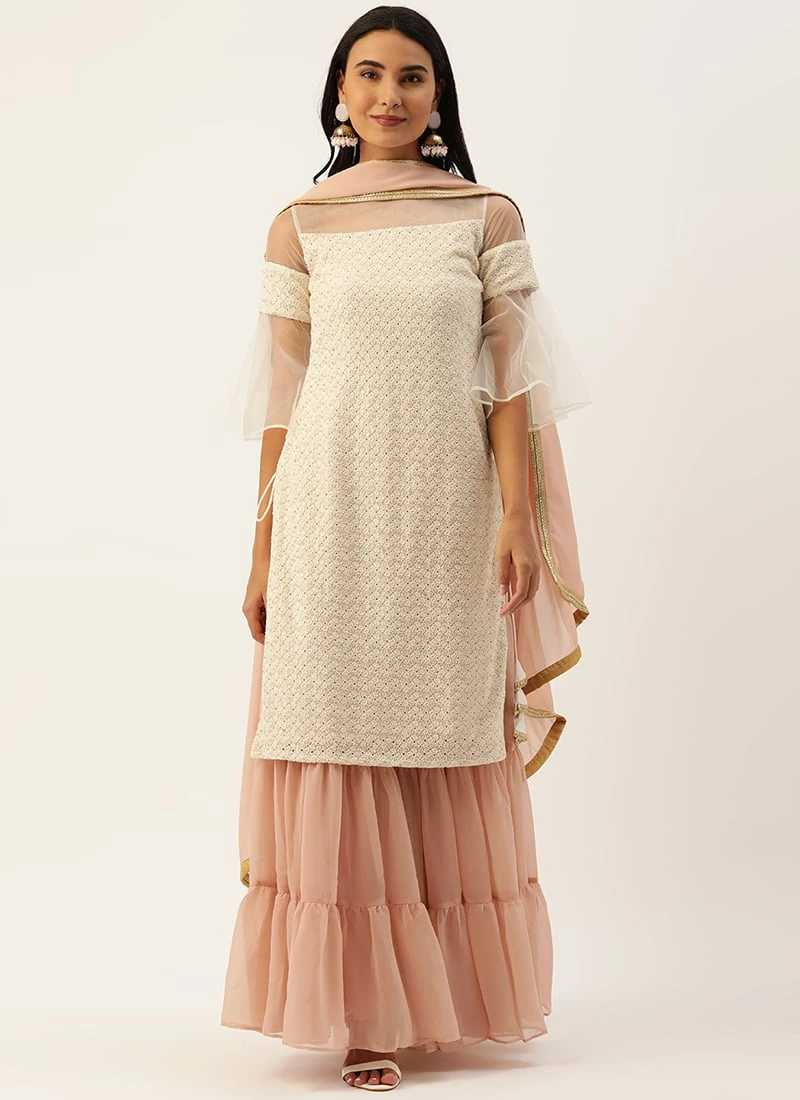 Teen Girls Off White Embroidered N Pink Layered Palazzo Suit Festive Wear