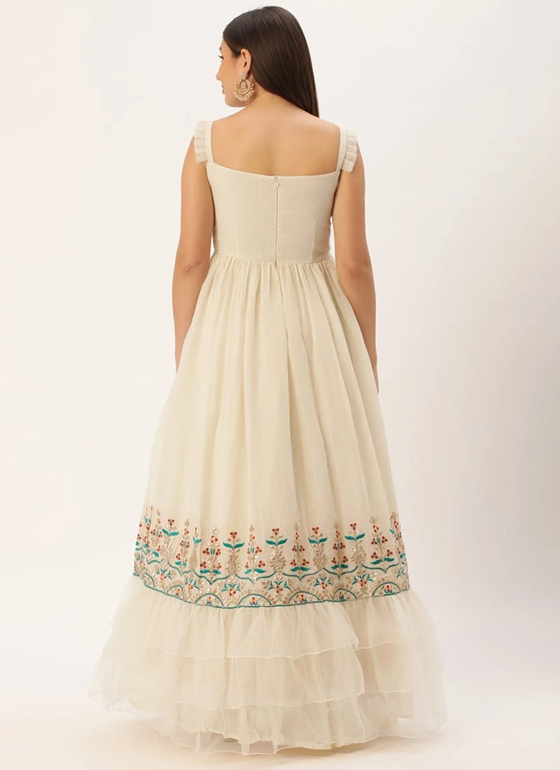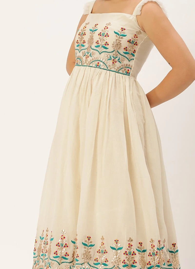 Teen Girls Off White Gota Patti Cotton Embroidered Gown Festive Wear