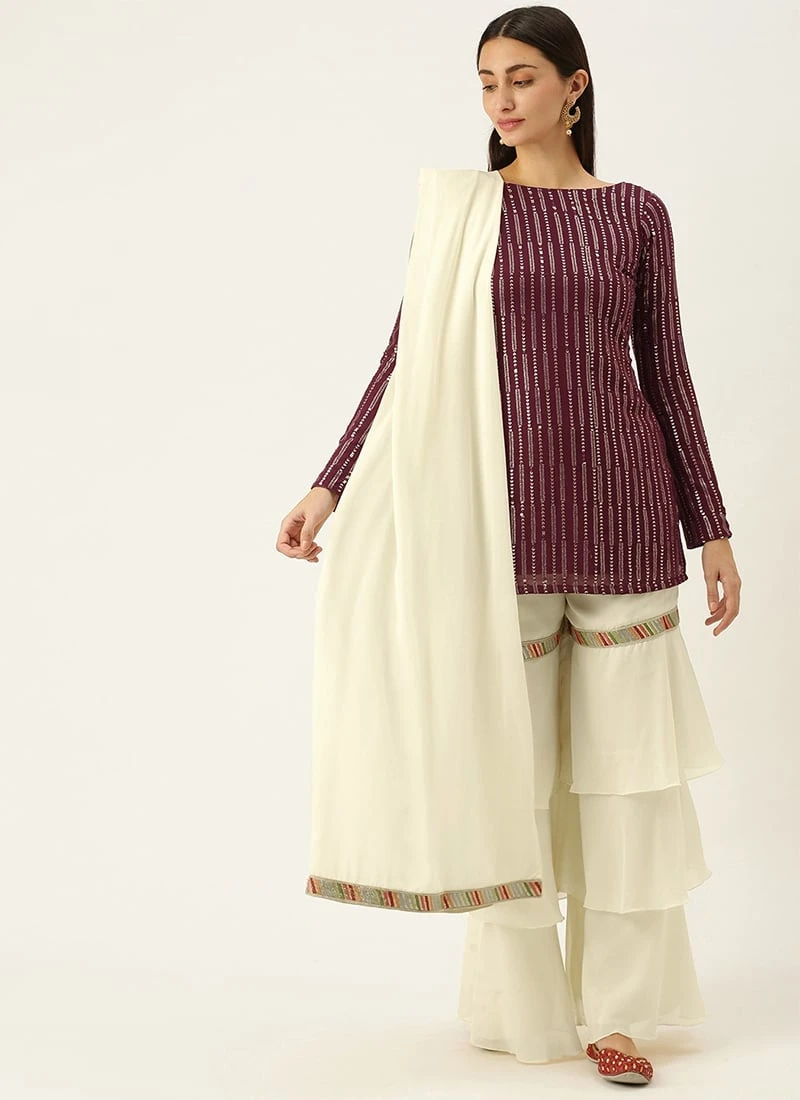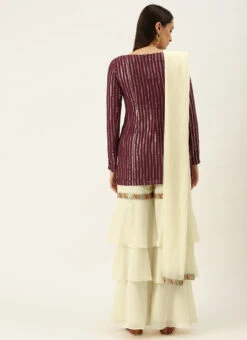 Teen Girls Off White N Marron Embroidered Layered Gharara Suit Festive Wear
