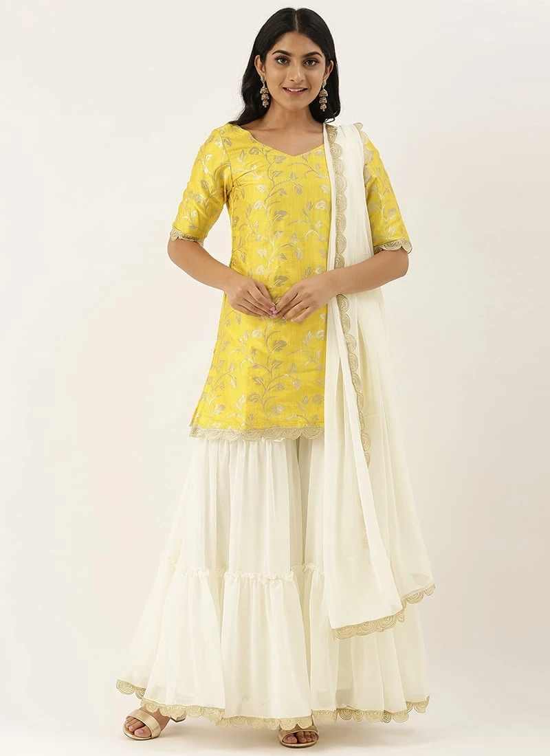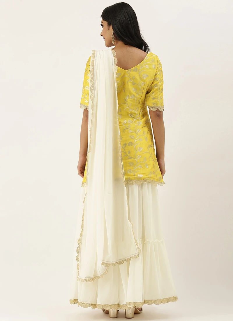 Teen Girls Off White N Yellow Jacquard Tiered Sharara Set Festive Wear