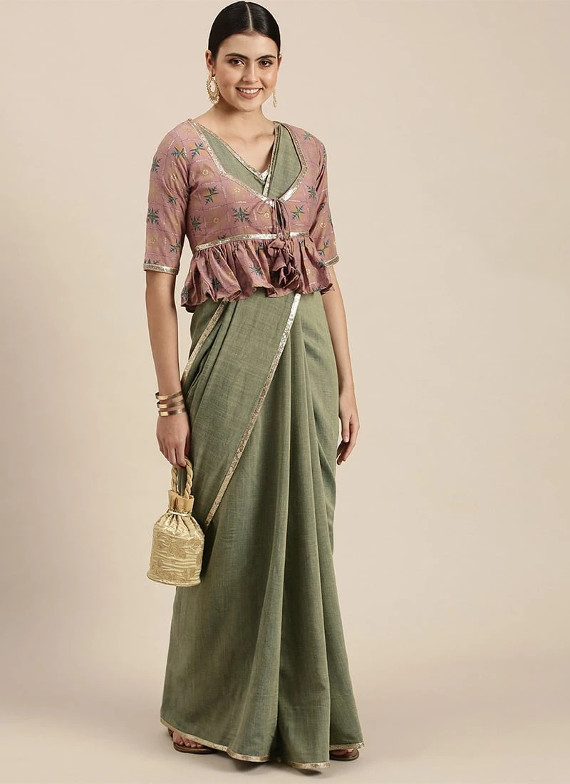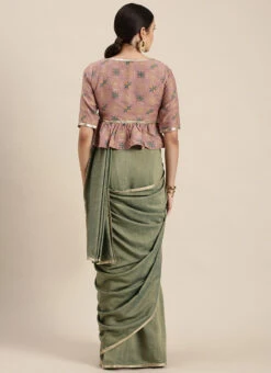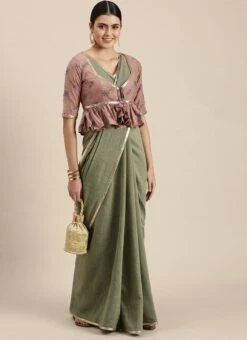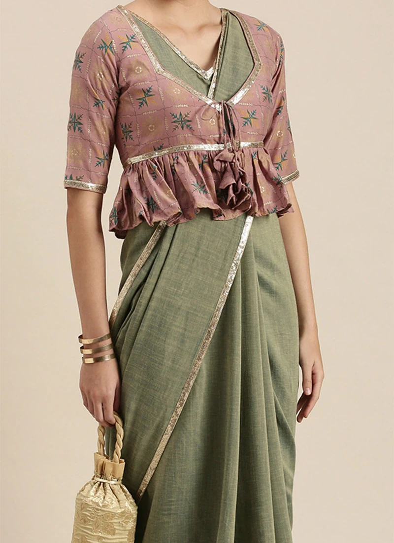 Teen Girls Olive Green Saree N Blouse With Pink Jacket Festive Wear