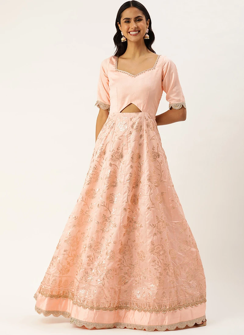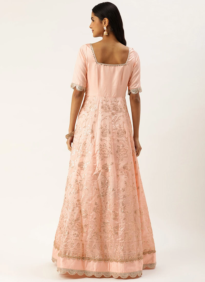 Teen Girls Peach Art Silk Sequins Embroidered Gown Festive Wear