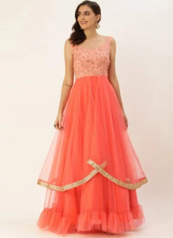 Presenting a layered style gown, features a peach embroidered yoke with the diamond neck in the front, square neck in the back, yoke until natural waist-length, has a beautiful peach net high an low full circulate net flare starting from knee to calf with trim detailing, followed by a full circular floor length flare along with gathered edges. It has side zip closure. Mask only for shoot purpose.Refer the fabric image for true color of the dress. This dress is custom designed from fabric and custom stitched. Once sold cannot be returned.Designs, colors, and patterns on the actual product may slightly vary from designs shown in the image. Images are the only representative