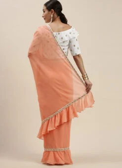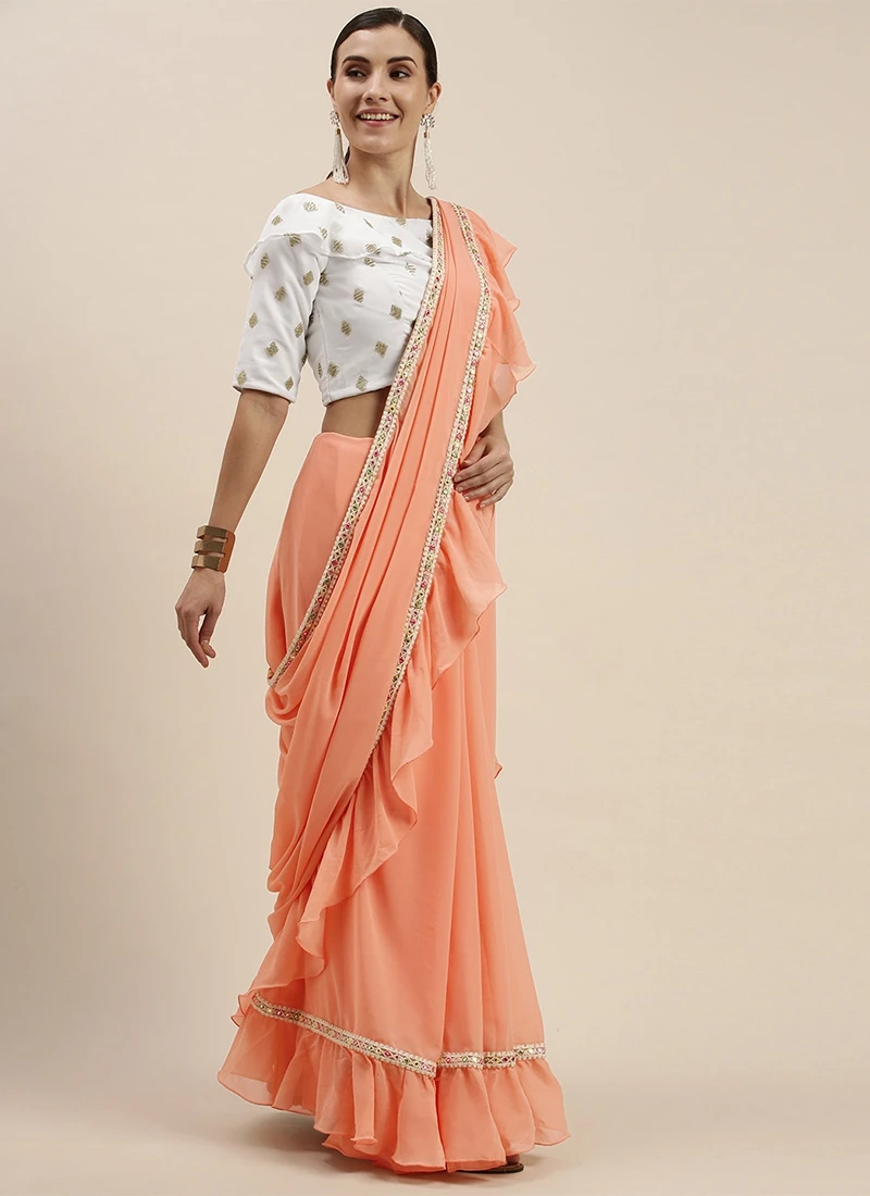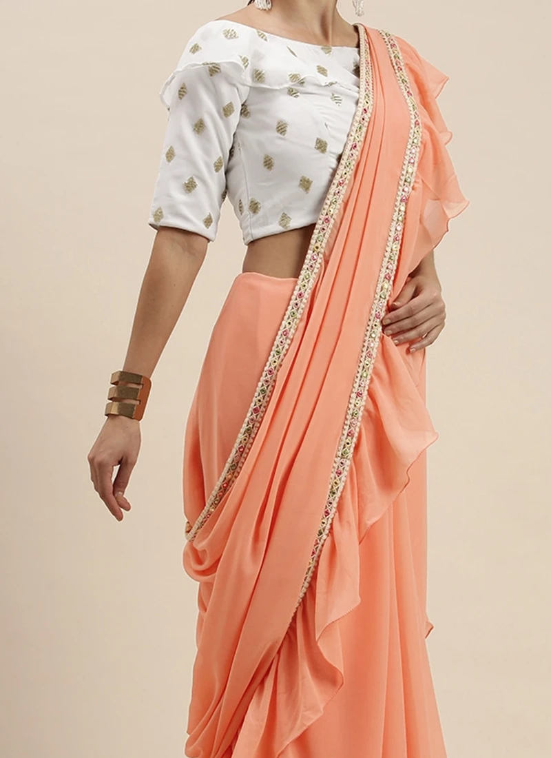Teen Girls Peach Georgette Saree N White Embroidered Blouse Festive Wear