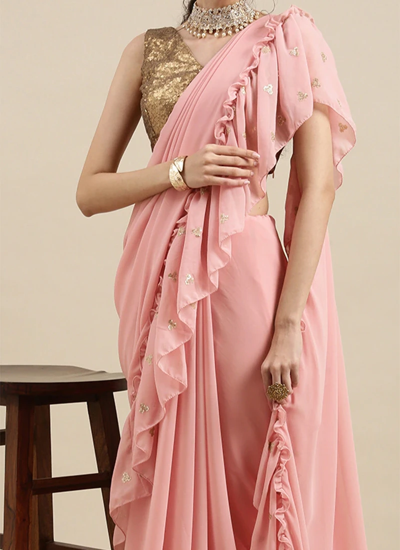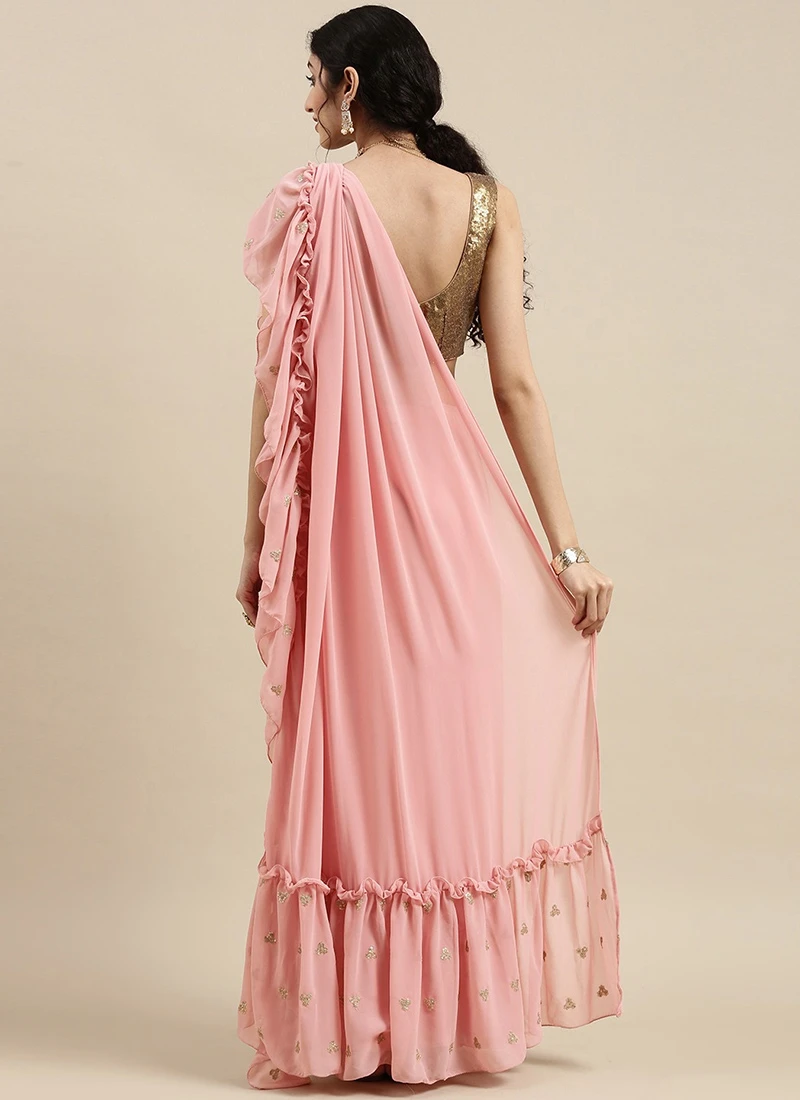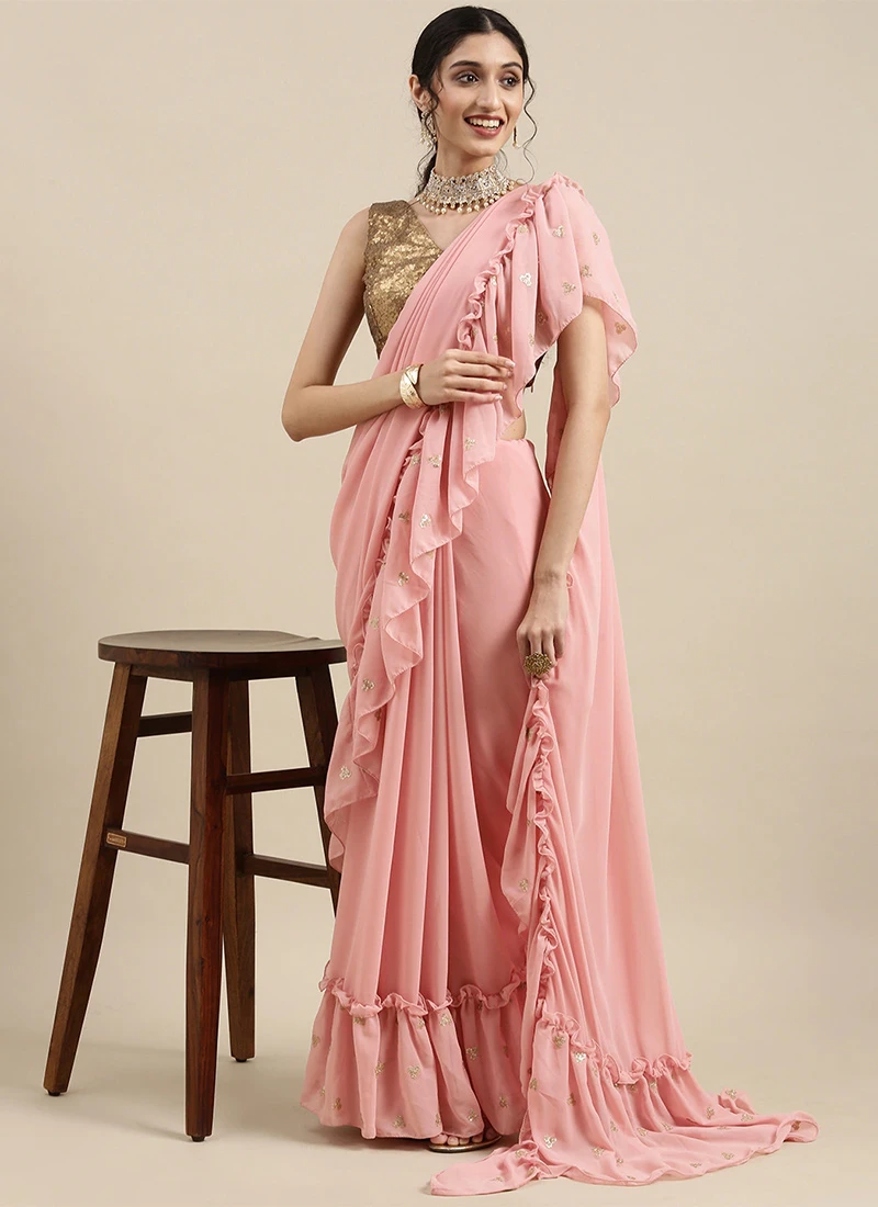 Teen Girls Pink Embroidered Georgette Ruffle Saree After Six Wear