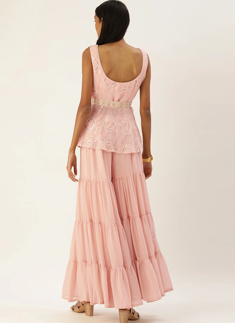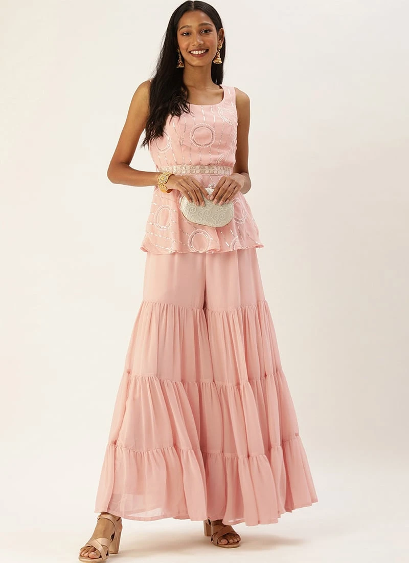 Teen Girls Pink Embroidered Peplum Top N Palazzo Set Festive Wear