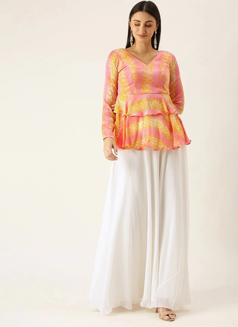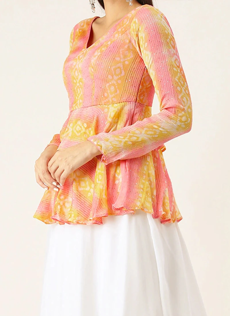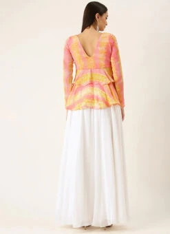 Teen Girls Pink Foil Printed Peplum Skirt Set Festive Wear