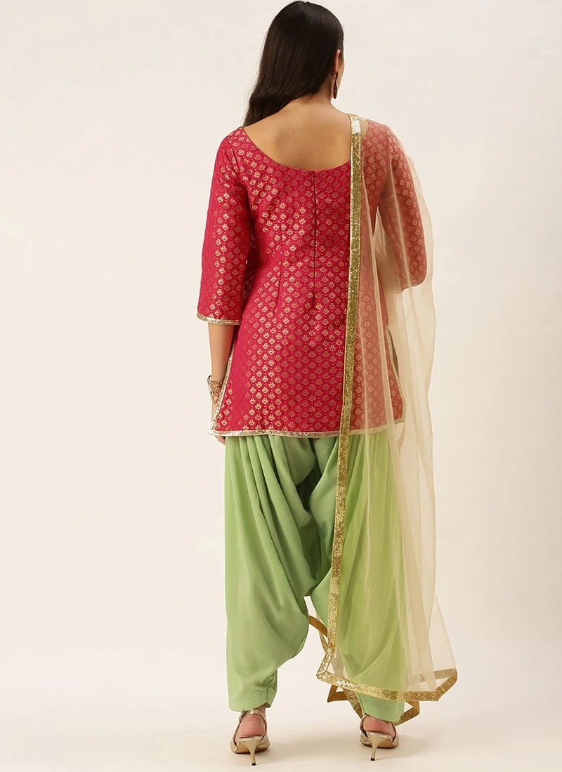 Teen Girls Pink Jacquard Top N Green Patiala Suit Party Wear