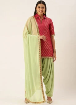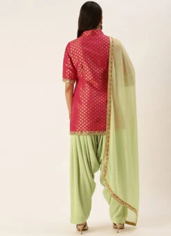 Teen Girls Pink N Green Jacquard Patiala Suit Set Festive Wear