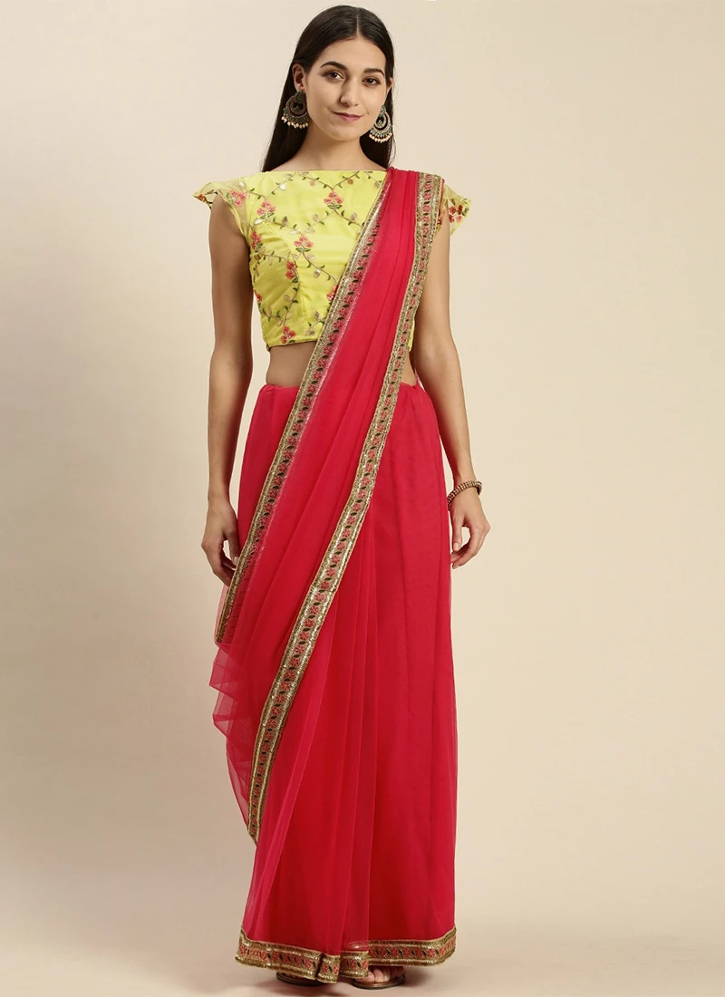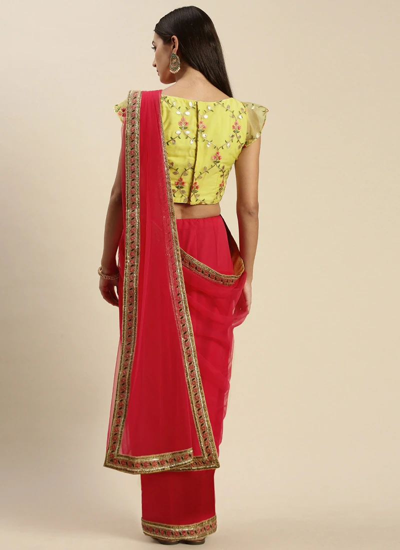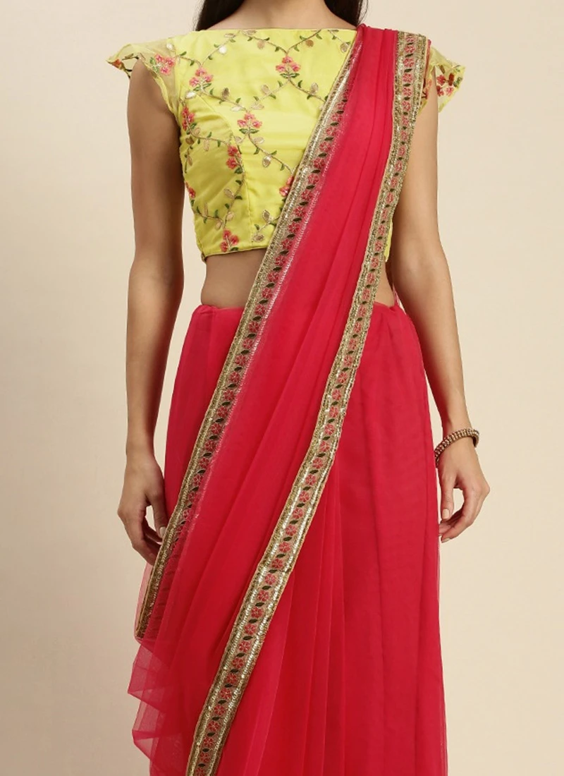 Teen Girls Pink N Yellow Embroidered Border Saree Festive Wear