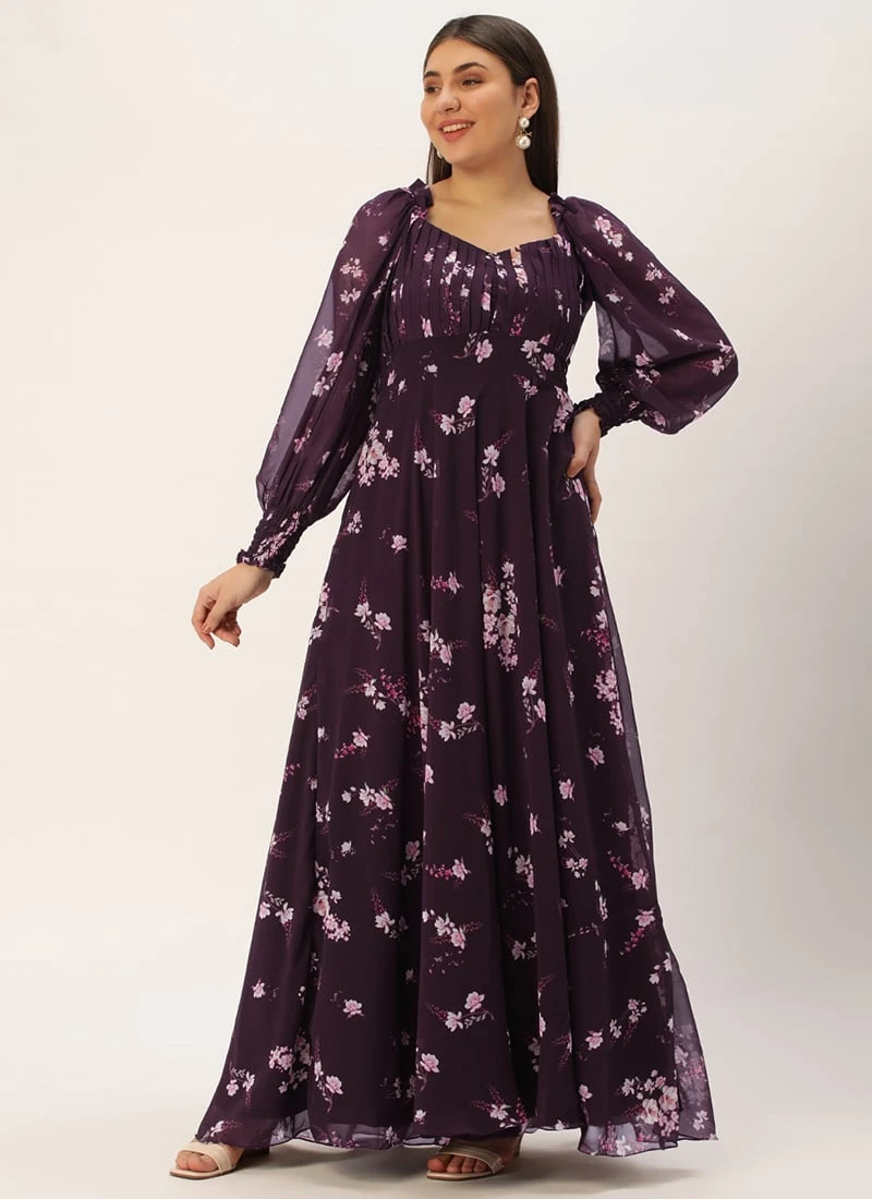 Teen Girls Purple Georgette Printed Pleated Yoke Gown Festive Wear
