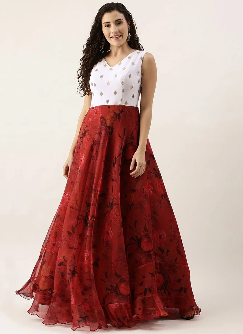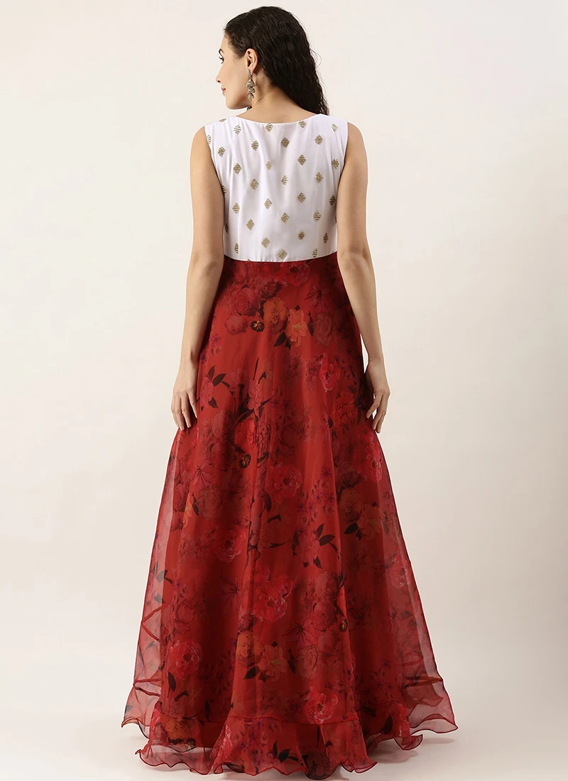 Teen Girls Red N White Embroidered Floor Length Gown Festive Wear