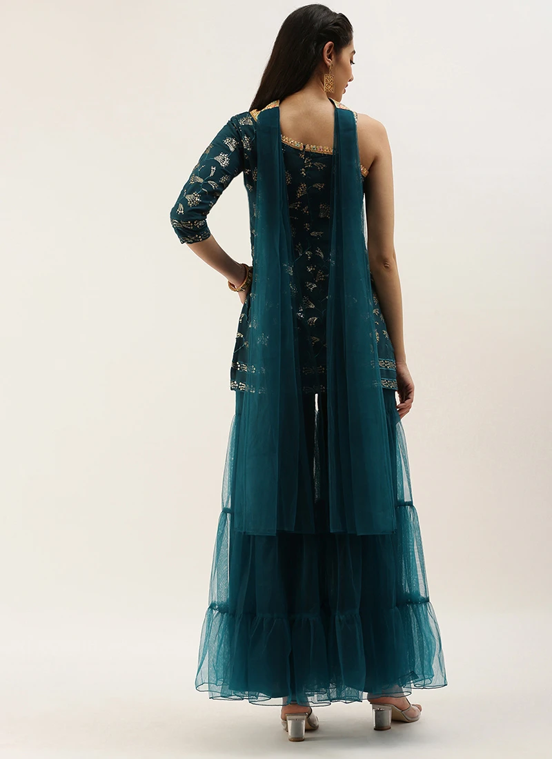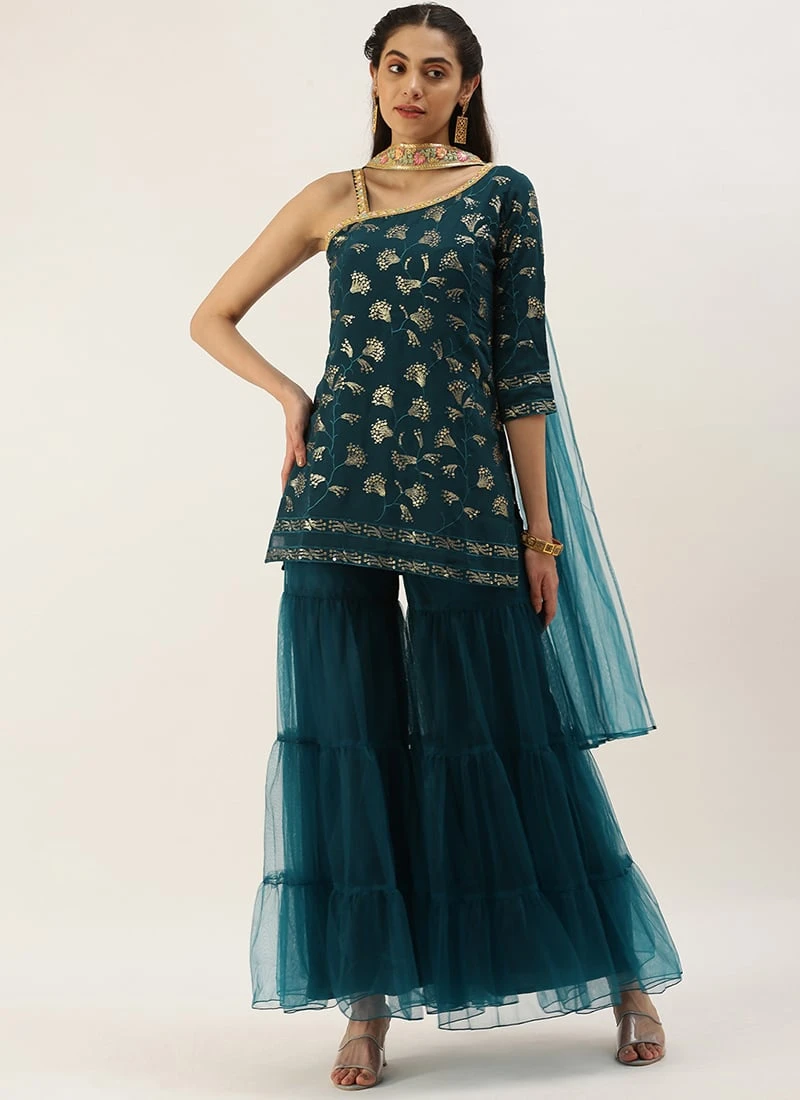 Teen Girls Teal Blue Georgette Embroidered Palazzo Suit Festive Wear