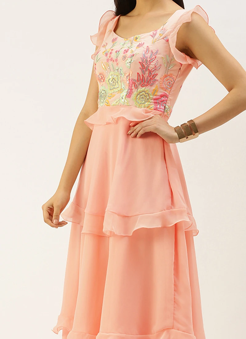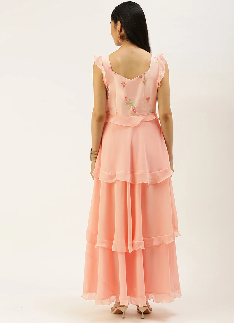 Teen Girls Teen Girl Peach Embroidered Tiered Gown Festive Wear