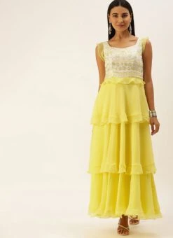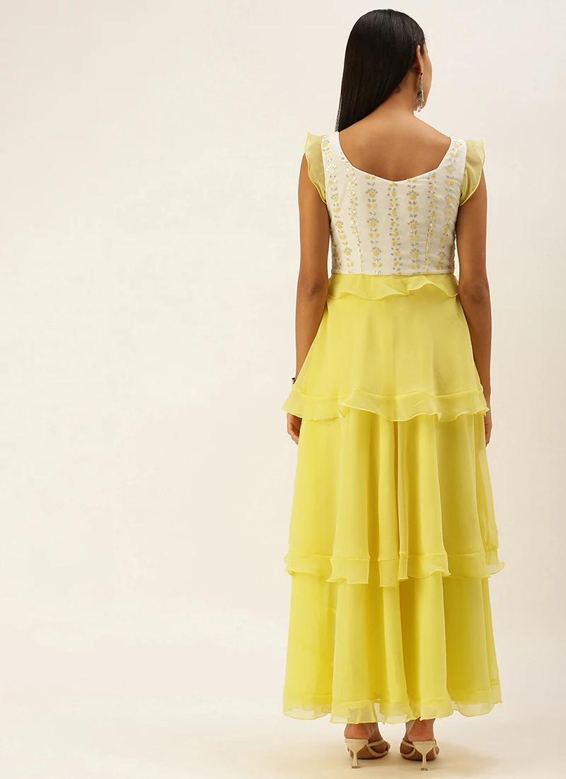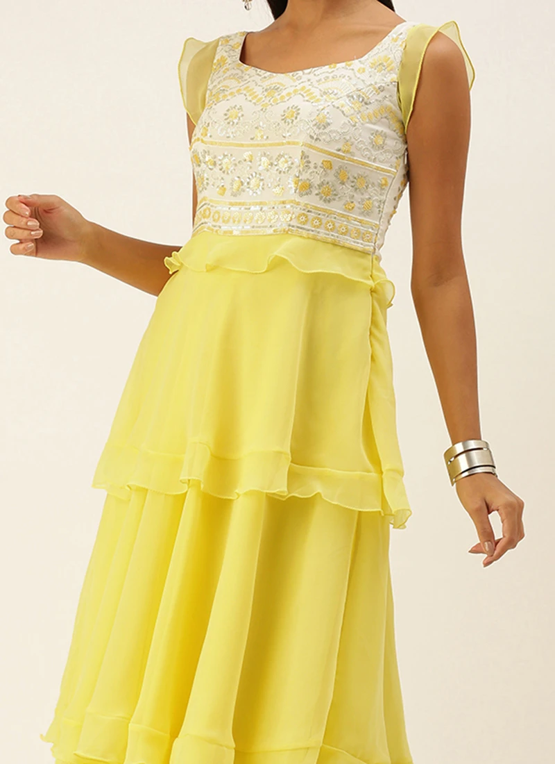 Teen Girls Teen Girl White Embroidered N Yellow Tiered Gown Festive Wear