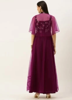 Teen Girls Wine Embroidered Gown With Cape Party Wear